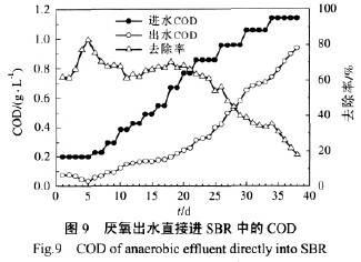 由圖9 可看出,當SBR 進水COD 為1 139 mg/L時,出水COD 為937 mg/L,且有不斷上升的趨勢,COD 去除率低于20%。經分析,厭氧進水為出水全回流,難降解大分子物質的不斷積累會加重UASB和SBR 的負擔,厭氧出水SS 含量與色度過高,好氧出水不達標,對整個工藝流程均產生不利影響。