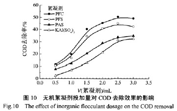 由圖10 可以看出,隨著絮凝劑加入量的增加,廢水COD 的去除率呈明顯上升趨勢。當絮凝劑的加入量達到2.5 mL 時,PFC+PAM、PFS+PAM、PAS+PAM、KAl (SO4)2+PAM 處理后的廢水COD 分別為1.133、1.256、1.511、1.566 g/L,去除率分別為50.3%、44.9%、33.7%、31.3%,鐵系絮凝劑明顯好于鋁系絮凝劑。繼續增加絮凝劑量時,COD 去除率不再上升,反而有下降的趨勢。因此PFC 投加量為2.5 mL、PAM投加量為0.5 mL 時,COD 去除率效果最好。