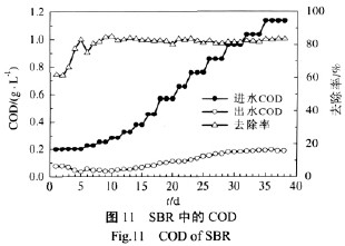 先用啤酒加自來水配制COD 為0.2 g/L 的模擬啤酒廢水對SBR 中的好氧活性污泥進行培養,運行5 d 后,將經絮凝沉淀的厭氧出水用自來水稀釋5 倍后加入SBR,然后通過降低稀釋倍數將進水的COD逐步由0.226 g/L 提升到1.13 g/L。SBR 中COD 的變化情況見圖11。