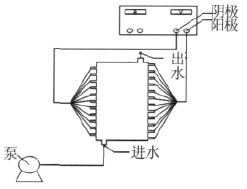 筆者采用的單級并聯式電絮凝反應器,陽極為鋁板,直徑10 cm,厚1 cm,陰極為不銹鋼板,直徑10 cm,厚4 mm,極板間距為1 cm,共23 層。裝置如圖1、2 所示。廢水從下端進入反應器后折疊流動,經處理后,從上端出水口排出。這種進水方式,可使廢水與反應器完全接觸,并分布均勻,從而使各個單元都能充分作用。極板與反應器邊緣的空隙,可使形成的絮體及時排出。這種構造抗沖擊負荷能力較強,較其他形狀反應器更能承受波動較大的進水〔7〕。