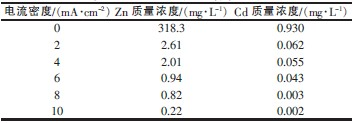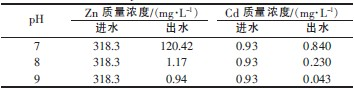 廢水取自湖南某冶鋅廠,水質指標如下:廢水呈酸性,pH 為3.08,SO42-質量濃度為1.5~2.0 g/L。廢水中含有Zn2+和Cd2+兩種重金屬離子,其質量濃度分別為318.3、0.93 mg/L,分別為排放標準的320 倍和18.6 倍。