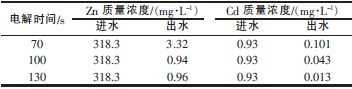 以小試研究為基礎,定制了中試設備,處理量達24 m3/d,在小試試驗選擇的最優條件(pH=9,電解時間100 s,電流密度6 mA/cm2)下運行,當Zn2+進水為150 mg/L 左右時,Zn2+出水質量濃度低于0.22 mg/L;Cd2+進水為15 mg/L 左右時,Cd2+出水質量濃度低于0.04 mg/L,達到GB 25466—2010 排放標準要求。具體參見http://www.bnynw.com更多相關技術文檔。