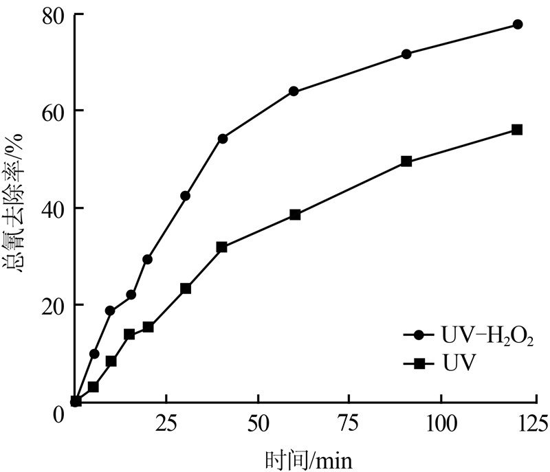 圖 2 UV照射和UV-H2O2工藝對總氰的處理效果