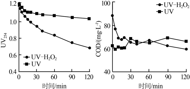 圖 3 UV和UV-H2O2處理過程中UV254和COD變化情況