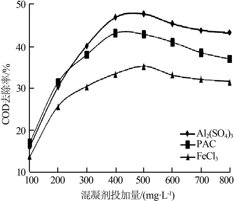 由圖 1可知,Al2(SO4)3的混凝處理效果優于其他兩種絮凝劑,PAC次之,FeCl3最差。Al2(SO4)3投加量對混凝效果有很大影響,隨著其投加量的增加,COD去除率先升高后降低,當投加量為400 mg/L時COD去除率達到最大,為48.8%。這是因為投加量較少時,Al2(SO4)3先水解形成高分子聚合物,然后與廢水中的膠體顆粒發生電中和作用,聚集成較小的絮凝體,小絮體運動中相互碰撞聚集形成沉淀性能較好的較大絮凝體。Al2(SO4)3投加量過大會使膠體顆粒重新帶上與原來相反的電荷相互排斥,達到新的穩定平衡狀態,所以COD去除率出現不升反降的現象。后續試驗選擇Al2(SO4)3作為混凝劑。