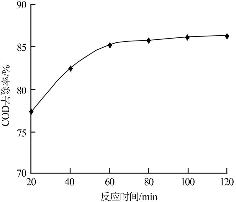 (4)反應時間對COD去除率的影響。將體系初始pH調至4,在H2O2投加量為8 mmol/L、Fe2+投加量為6 mmol/L的條件下,考察反應時間對COD去除率的影響,結果見圖 2。