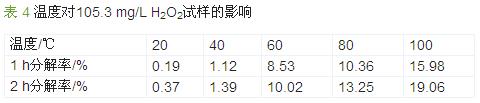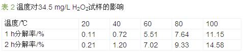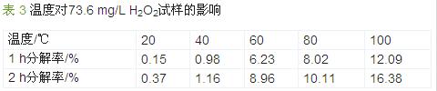 (2)溫度對H2O2分解的影響。為分解H2O2同時又不產生二次污染物,考察溫度對H2O2分解效果的影響。取不同質量濃度的H2O2試樣置于水浴鍋內,調節水浴溫度至一定值,恒溫放置l~2 h,然后用KMnO4法測定H2O2質量濃度,計算其分解率。試驗結果如表 2~表 4所示。