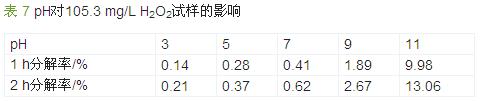 (3)pH對H2O2分解的影響。取不同質量濃度H2O2試樣,分別加入少量的酸和堿,調節pH至一定值,分別放置1~2 h,隨后用KMnO4法測定H2O2質量濃度,計算其分解率。試驗結果如表 5~表 7所示。