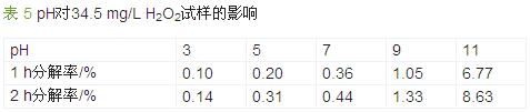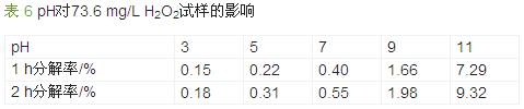 對比表 5~表 7可以看出,pH的變動對H2O2的分解率有一定影響,H2O2質量濃度越高影響越大;當溶液呈偏酸性和中性時,分解率非常低;pH偏高H2O2的分解會加速,但各pH條件下2 h時的分解率都<15%,表明pH對低濃度H2O2的分解影響不大,所以此方法也不適宜去除低濃度的H2O2。