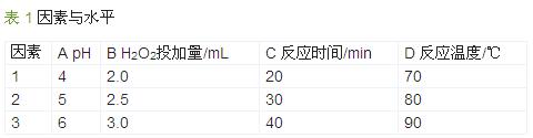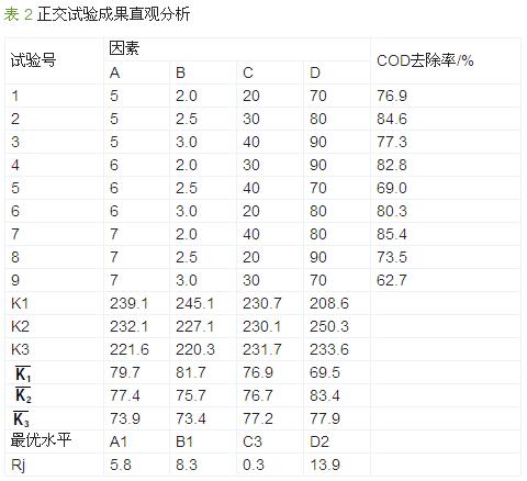 由表 2可見,影響COD去除率的因素主次順序依次為:反應(yīng)溫度>H2O2投加量>pH>反應(yīng)時間,最優(yōu)水平組合為A1B1C3D2。而直接從表中看到最好水平組合為(即第7號試驗)A3B1C3D2,可與極差分析找到的最優(yōu)水平組合A1B1C3D2做對比試驗,經(jīng)測定A1B1C3D2的COD的去除率為85.8%。因此最終優(yōu)化處理條件為:反應(yīng)溫度為80 ℃,H2O2投加量為2 mL,pH為5,反應(yīng)時間為40 min,且測得BOD5為146 mg/L,B/C=0.43。在此優(yōu)化條件下,可生化性也大大提高。