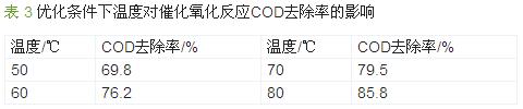 在其他反應(yīng)條件不變時,考察不同反應(yīng)溫度對COD去除率的影響,結(jié)果表明:反應(yīng)溫度對COD去除率的影響較明顯。當20 ℃時,COD去除率只有13.5%。隨著反應(yīng)溫度的升高,COD去除率逐漸加大,當溫度增加至80 ℃時,COD去除率達到最大值(77.6%),而后,COD去除率隨溫度的增加而降低。