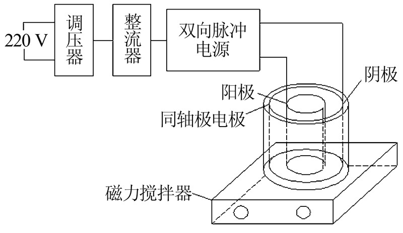 試驗裝置如圖 1所示,同軸極電化學裝置的陰極和陽極由內徑為60 mm和20 mm的純鋁管組成,陽極管有長條開口,目的是在攪拌過程中方便燒杯內水體流動使溶液均勻混合。兩同軸極極板壁厚均為1 mm,極板間距為20 mm。電源為自制雙向脈沖電源,試驗時占空比調至0.7,脈沖頻率為400 Hz。
