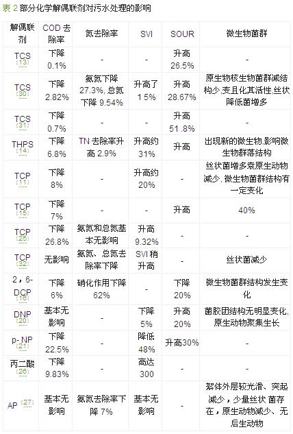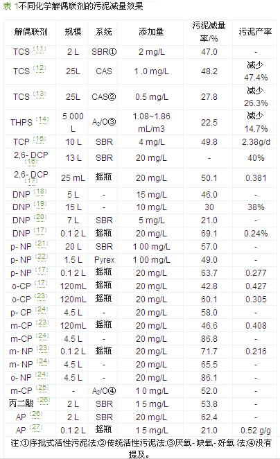文獻表明化學解偶聯劑的污泥減量可達到 21%~87%,不同化學解偶聯劑的污泥減量效果如表 1所示。