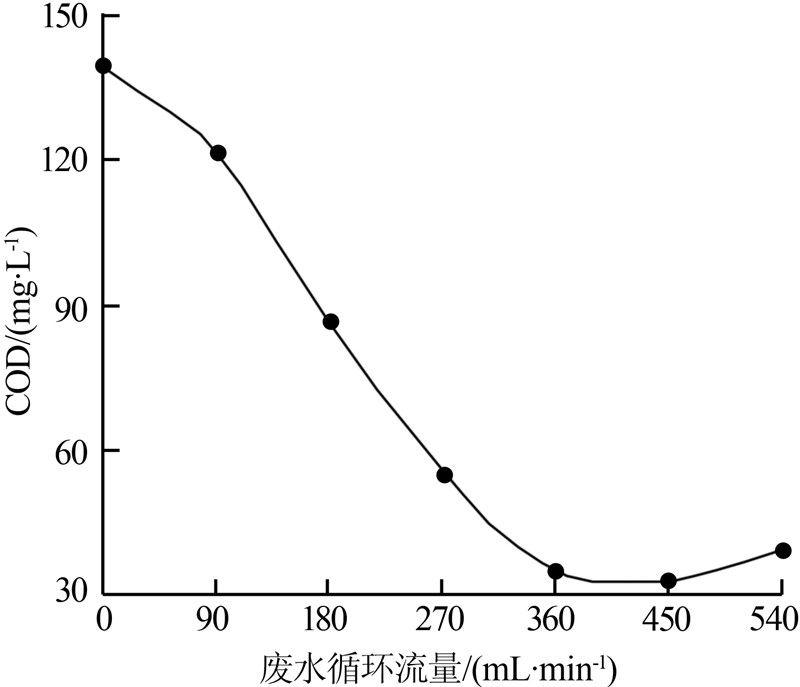 從圖 2可見,隨著廢水柱外循環流量從0增加到360 mL/min,出水COD由140 mg/L降低到35 mg/L。繼續增加柱外循環流量至540 mL/min時,廢水COD無明顯降低。考慮運行成本及處理效果,柱外循環流量以360 mL/min為宜。