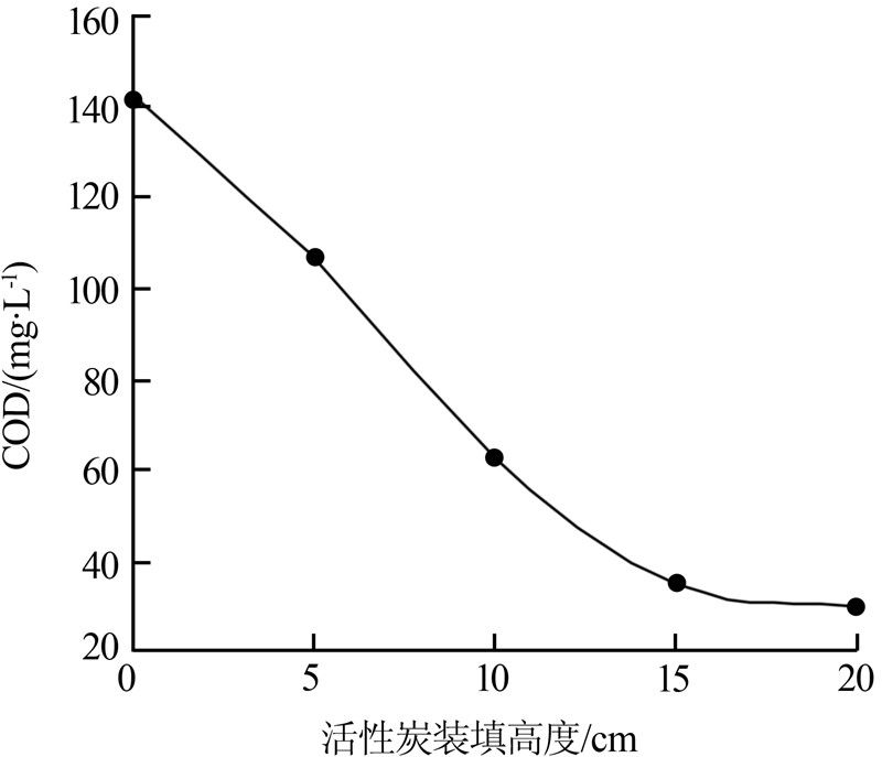 在去除堿度+柱外循環條件下,隨著活性炭裝填高度從0增加到15 cm,出水COD由142 mg/L降到35 mg/L,呈現明顯降低的趨勢,可見在廢水柱外循環以保證物料很好混合的前提下,活性炭的催化作用能夠體現出來。繼續增加裝填高度到20 cm時,出水COD僅降到30 mg/L,降低趨勢偏緩。考慮到運行成本,活性炭裝填高度以15 cm為宜。