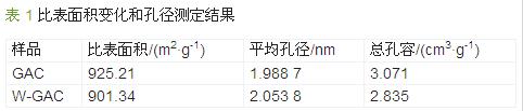 對(duì)改性后的活性炭進(jìn)行比表面積測(cè)定和孔徑分析,結(jié)果如表 1所示。