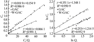 在一系列250 mL錐形瓶中分別加入0.05 g GAC或W-GAC,之后向瓶?jī)?nèi)倒入100 mL質(zhì)量濃度分別為10、20、30、40、50、60、70、80、90、100 mg/L的亞甲基藍(lán)溶液,此時(shí)活性炭的投加量為0.5 g/L,放入恒溫?fù)u床中振蕩,溫度控制在20 ℃,設(shè)置轉(zhuǎn)速為130 r/min。吸附飽和后,取上清液測(cè)定亞甲基藍(lán)平衡濃度(Ce),根據(jù)吸附前后亞甲基藍(lán)濃度差、溶液體積和吸附劑用量計(jì)算活性炭對(duì)亞甲基藍(lán)的吸附容量(Qe)。對(duì)試驗(yàn)數(shù)據(jù)分別做Langmuir吸附等溫線和Freundlich吸附等溫線擬合,如圖 5、表 3所示。