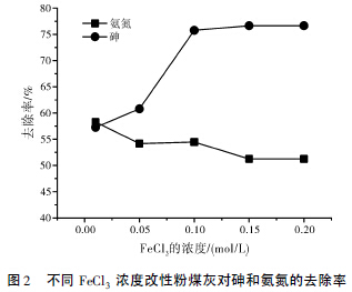 由圖2 可知: 隨著改性劑FeCl3濃度的增加,砷的去除率逐漸增加,當其濃度高于0. 1 mol/L 時,砷的去除率基本達到穩定; 而氨氮的去除率卻隨FeCl3濃度的增加而降低。分析認為,復合改性的粉煤灰中,鐵離子會覆蓋在粉煤灰的表面,因鐵離子會和砷酸根反應,生成沉淀物被粉煤灰吸附,因此砷的去除率會隨鐵離子濃度而增加; 而氨根離子和鐵離子均為陽離子,復合改性后的粉煤灰中,鐵離子很可能占用了銨根的吸附點位,導致銨根離子的去除率有所下降。