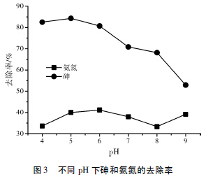 由圖3 可知: 隨著pH 的增大,砷的去除率整體呈下降趨勢,當pH 超過6 時,去除率急劇下降,這可能是因為堿性條件下,砷酸根離子和氫氧根離子與鐵離子的結合有競爭作用,導致了砷去除率的下降。在酸性條件下,氨氮的去除率隨著pH 的提高而增大,在pH 為中性時達到高峰后又下降,在pH =8 時又開始上升。分析認為,這是由于在酸性環境中,存在大量的H+。根據陽離子交換順序: