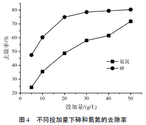 由圖4 可知: 投加量在20 g/L 以下,隨著投加量的的增加,砷的去除率的提高較明顯,在投加量超過20 g/L 后,隨著投加量的繼續增加,砷的去除率變化較為平緩,變化幅度較小; 氨氮去除率隨著投加量的增加而增加,投加量超過40 g/L后去除率還在持續增加,說明砷達到了平衡吸附量時,氨氮還未達到。