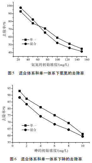 從圖5 可知: 當砷的初始濃度低于2mg/L 時,混合體系中氨氮的去除率高于單一體系下的去除率,說明此時少量的砷促進了改性粉煤灰對氨氮的吸附; 當砷的初始濃度較高時,混合體系中氨氮的去除率低于單一體系下的去除率。從圖6 可知:在單一體系下砷的去除率比混合體系下的高。