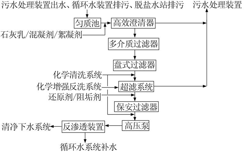 有效的預(yù)處理+超濾(UF)+反滲透膜(RO)的組合工藝,不僅能高效、穩(wěn)定地去除污染物,而且可避免反滲透膜的污堵,確保出水符合回用水水質(zhì)標(biāo)準〔1, 2, 3, 4〕,其在回用水處理的工程設(shè)計中得到了一定的應(yīng)用。