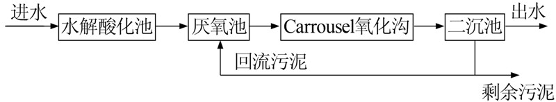 試驗原水由泵抽送至高位水箱,后重力流入水解酸化反應器,先后經過水解酸化反應器的反應區和沉淀區,在沉淀區由泵抽送上清液進入厭氧池底部。厭氧池溢流出水進入改良Carrousel氧化溝,由微孔曝氣器進行曝氣。改良Carrousel氧化溝出水進入二沉池,沉淀后上清液排放,部分污泥回流至厭氧池,剩余污泥排放。