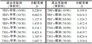 實驗考察了水油相比對分配系數的影響,結果表明隨著水油相比的增加,分配系數呈下降趨勢,綜合成本因素確定絡合萃取實驗的水油相比為1∶1。