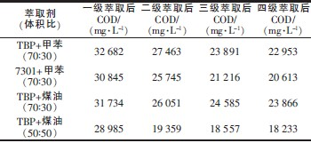 由表2 可以看出,TBP+煤油體系(體積比50∶50)對咖啡因廢水的萃取效果最好。且一、二次萃取效果最好,因此確定萃取級數為2 次。