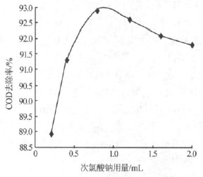 實驗考察了次氯酸鈉用量對COD 去除率的影響,見圖3。由圖3可見, COD 去除率隨著次氯酸鈉用量的增加而增加,但當次氯酸鈉>0.8 mL 以后,COD 去除率反而下降,實驗確定次氯酸鈉用量為0.8 mL。具體參見http://www.bnynw.com更多相關技術文檔。