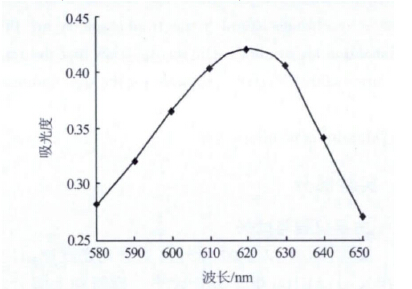 由圖 1 可知,在615~625 nm 波長范圍內均可獲得滿意的吸光度值,最大吸收波長與標準方法一致。