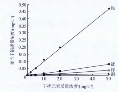 由圖 4 可知,干擾元素濃度越大,對測定結果的影響越大,其中鐵的干擾最為明顯,其次為錳、鋅、銅。