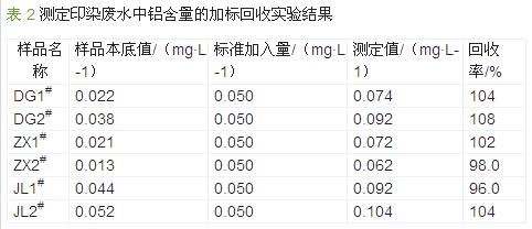 在3 個不同印染廠的污水處理站排放口取6 批水樣,于實驗室采用濃硝酸-過氧化氫濕消化法按 1.3.1 操作過程對6 批水樣進行前處理,再以優化后的標準方法測定6 批試樣中的鋁含量,結果見表 2。
