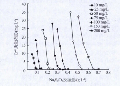 由圖 1 可以看出,對特定濃度的含鉻廢水,反應后上清液中的Cr6+濃度隨Na2SO3 投加量的增加,前期均表現為迅速降低,后趨于平緩。根據實驗結果,不同Cr6+濃度的含鉻廢水達到處理要求時的最小 Na2SO3 投加量見表 1。