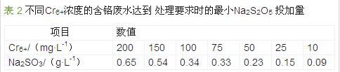 對比表 1 和表 2 可知,在Cr6+濃度變化范圍內, Na2S2O5 的投加量比Na2SO3 減少了25.0%~37.5%。