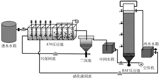 A2O 工藝具有同時去除有機物、氮和磷,且總水力停留時間(hydraulic retention time,HRT) 短、易操作控制、處理水量大、運行費用較低等優點,是中國污水處理最簡單的同時脫氮并除磷的工藝之一.但該工藝也存在著缺點,在同一反應系統中同時存在聚磷菌和硝化細菌,由于聚磷菌和硝化細菌對污泥齡要求不一樣,這將引起2 種細菌對污泥齡要求的矛盾[1-3].針對A2O 工藝存在的缺陷,提出了A2OBAF聯合工藝,該聯合工藝中A2O 系統主要完成的是有機物的去除、除磷、反硝化,而將曝氣生物濾池(biological aerobic filter,BAF) 置于二沉池之后,主要目的是完成硝化,BAF 的部分出水回流到A2O系統的缺氧段為反硝化作用和缺氧吸磷作用提供相應的電子受體.該雙污泥工藝解決了傳統A2O 工藝硝化菌與聚磷菌泥齡矛盾,且最大程度地發揮了活性污泥與生物膜這2 種處理技術的優勢.因硝化作用在BAF 中進行,使得回流污泥中不含或含有少量的硝態氮,從而進一步解決了在厭氧區反硝化菌與聚磷菌對碳源的爭奪[4-7].