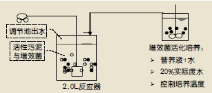 生物增效實驗方法采用:原廢水+活性污泥+生物增效菌產(chǎn)品,然后與原廢水+活性污泥(不加增效產(chǎn)品)進行對比。生物增效特效菌培養(yǎng)后,通過P LC控制自動運行和向污水系統(tǒng)定時投加足量高活性特效菌及將酶投加至污水處理工藝好氧段之后,加速系統(tǒng)廢水中的污染物分解。生物增效菌的投加點選在曝氣池的進水處,以確保生物增效菌在好氧系統(tǒng)的作用最大發(fā)揮。B i o-Zy m e系列特效C O D菌群每天投加量約6300L,菌種密度為108~109個/ml。Bio-Zyme系列特效樹菌群每天投加量為2000L,菌種數(shù)量2.35g/L。其工藝流程如圖4所示。