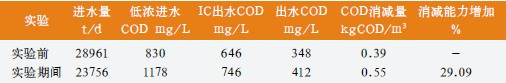2011年7月再次進行生物增效實驗,共進行36天,取得有效數(shù)據(jù)36組。根據(jù)系統(tǒng)運行狀況從進水量、高濃進水COD、低濃進水C O D、出水C O D四個方面分析實驗前后曝氣池系統(tǒng)對COD去除效果變化情況。實驗前后各參數(shù)平均值如表2所示。