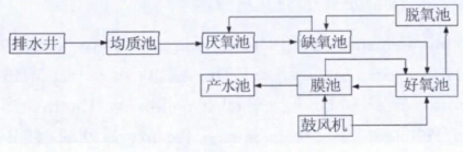 本中試實驗采用MBR 系統(A2O+膜過濾)。首先通過提升泵將待處理廢水由排水井提升至均質池,之后廢水先后自流通過厭氧池和缺氧池進行處理;缺氧池混和液部分被泵入好氧池繼續處理,部分回流到厭氧池,回流比為100%;好氧池混合液部分被膜池提升泵輸送到膜池進行泥水分離,部分回流到脫氧池后進入缺氧池,回流比為400%;膜池混合液部分回流到好氧池,回流比為400%。MBR 產水收集到反洗水池,作為MBR 反洗用水;多余的產水排放至總排放口。采用鼓風機為好氧池和膜池曝氣。實驗流程如圖 1 所示。