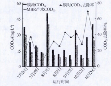 在MBR 系統中,由于對CODCr 的去除主要來自生化作用,因此實驗過程中對MBR 系統進水和膜池(污泥上清液濾紙過濾水樣)的CODCr 進行了監測,結果如圖 2 所示。
