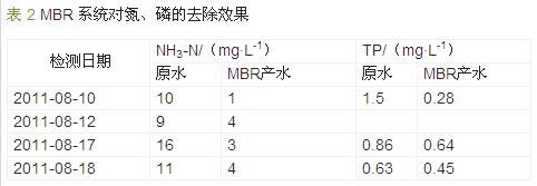2011 年8 月8 日的取樣分析結果表明,原水和MBR 產水的BOD5 分別為35、0.8 mg/L,原水和 MBR 產水的CODCr 分別為106、9 mg/L,B/C=0.33,說明該廢水具有一定的可生化性,而較低的產水BOD5 也說明碳源幾乎被完全降解。