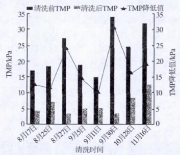9 月5 日后對維護性清洗方式進行了改變,先排空膜池污泥(移至生化池),注入RO 產水,再進行 NaClO(質量濃度增至3 000 mg/L)洗和鹽酸洗,清洗效果明顯改善,清洗周期延長至3 周左右。最后2 次清洗,由于清洗水溫低(14 ℃左右),清洗恢復性效果不如前幾次水溫較高時(25 ℃左右)明顯。