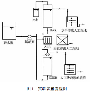 膨脹顆粒污泥床-人工快速滲濾系統(tǒng)( EGSBCRI):EGSB 為有機玻璃柱,直徑為0.2 m,高度為2m。CRI 由PVC 管材制作,內(nèi)徑為0.4 m,高為2 m。