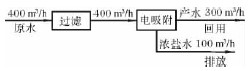 圖3 為雙膜技術工藝流程簡圖,圖中數字為小時水量。電吸附技術流程比雙膜技術工藝流程簡單。