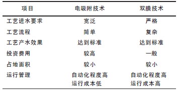 對電吸附技術與雙膜技術進行比較,其比較依據是市政達標污水400m3 /h(一級A 標準,電導率3 800 μS /cm)、產水水質達到《城市污水再生利用工業用水水質(GB /T 19923—2005)》循環冷卻水標準。比較的內容包括工藝流程、工藝進水要求、工藝產水效果、投資費用、占地面積、運行管理等項目。