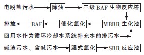 a.電脫鹽污水預處理。高濃度污水 中只有電脫鹽污水含油,且乳化程度比較高,采用破乳、隔油以及渦凹氣浮等單元設備分離其中的污油,再用三級BAF 對其進行生化預處理,處理后出水CODCr的質量濃度約為300 mg / L。預處理后的電脫鹽污水的電導率若小于1 200 μS / cm,就可以進入低濃度污水處理系統,否則進入高濃度污水處理系統。