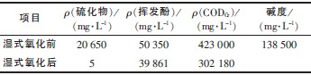 濕式氧化工藝利用空氣中的氧為氧化劑,在一定反應溫度(100 ~ 300 ℃)和壓力(0.2 ~ 10.0 MPa)下,把堿渣中的硫化鈉、硫氫化鈉和有機硫化物中的二價硫完全轉化為硫酸鹽或硫代硫酸鹽,而酚類化合物也得到部分氧化,消除了堿渣所特有的惡臭氣味,同時把堿渣中部分難生物降解有機物轉化為易生物降解有機物,提高了后續生物處理單元的效率。濕式氧化工藝處理堿渣污水結果如表2 所示。