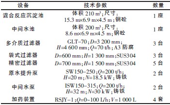 反滲透預處理的主體工藝以沉淀和機械過濾為主,由混合反應沉淀池+多介質過濾器+袋式過濾器+精密過濾器組成。在混合反應沉淀池內進行殺菌和沉淀處理,沉淀后的澄清水則經過中間水池進入到多介質過濾器;之后投加還原劑,使RO 進水的余氯<0.1 mg/L,達到反滲透進水要求;在精密過濾器前投加阻垢劑,防止反滲透系統出現結垢的情況。反滲透預處理的目的是使反滲透系統的進水SDI<5,同時保證反滲透系統中不會出現大量的微生物。主要設備清單如表1 所示。