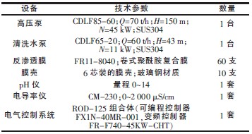 反滲透系統的主要作用是脫除水中的鹽分,保證出水的含鹽量符合回用要求。反滲透系統主要包括:RO 高壓泵、RO 清洗水泵、膜殼、電導率儀、反滲透膜及電氣控制系統等,具體的設備清單見表2。