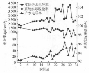 3. 2 反滲透系統實際進出水電導率和脫鹽率變化